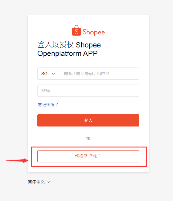 3.跳转到shopee授权页面,点击切换至子账户(子母账号必须为以:main的主账号),用子母账号登录。